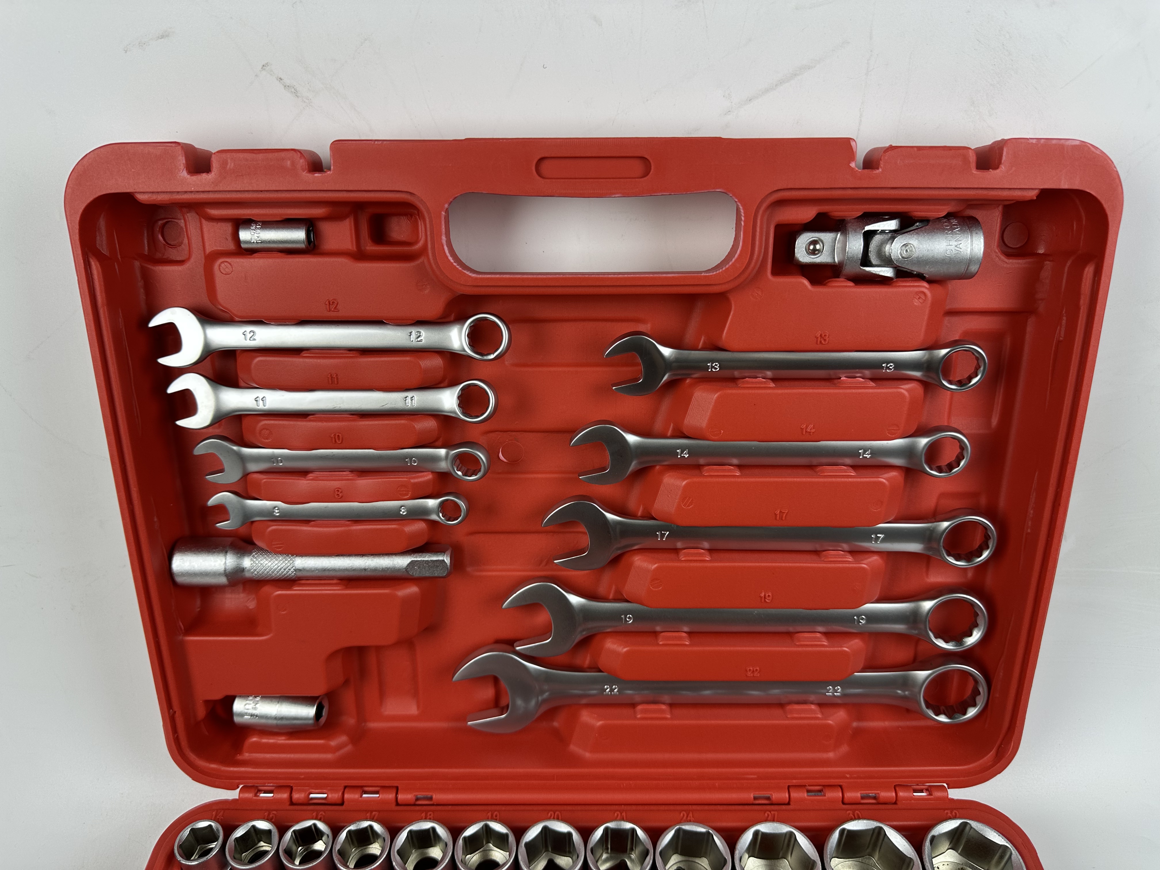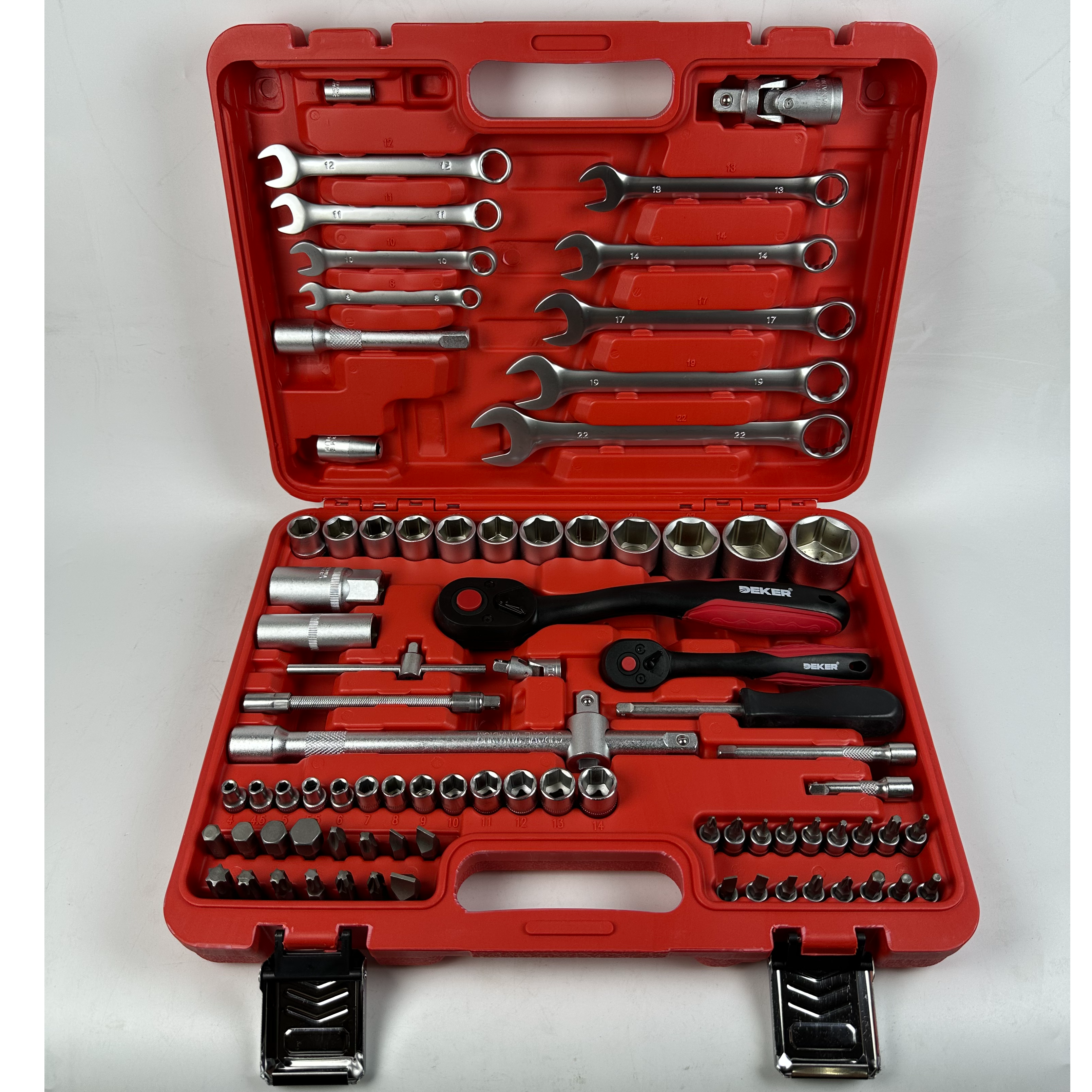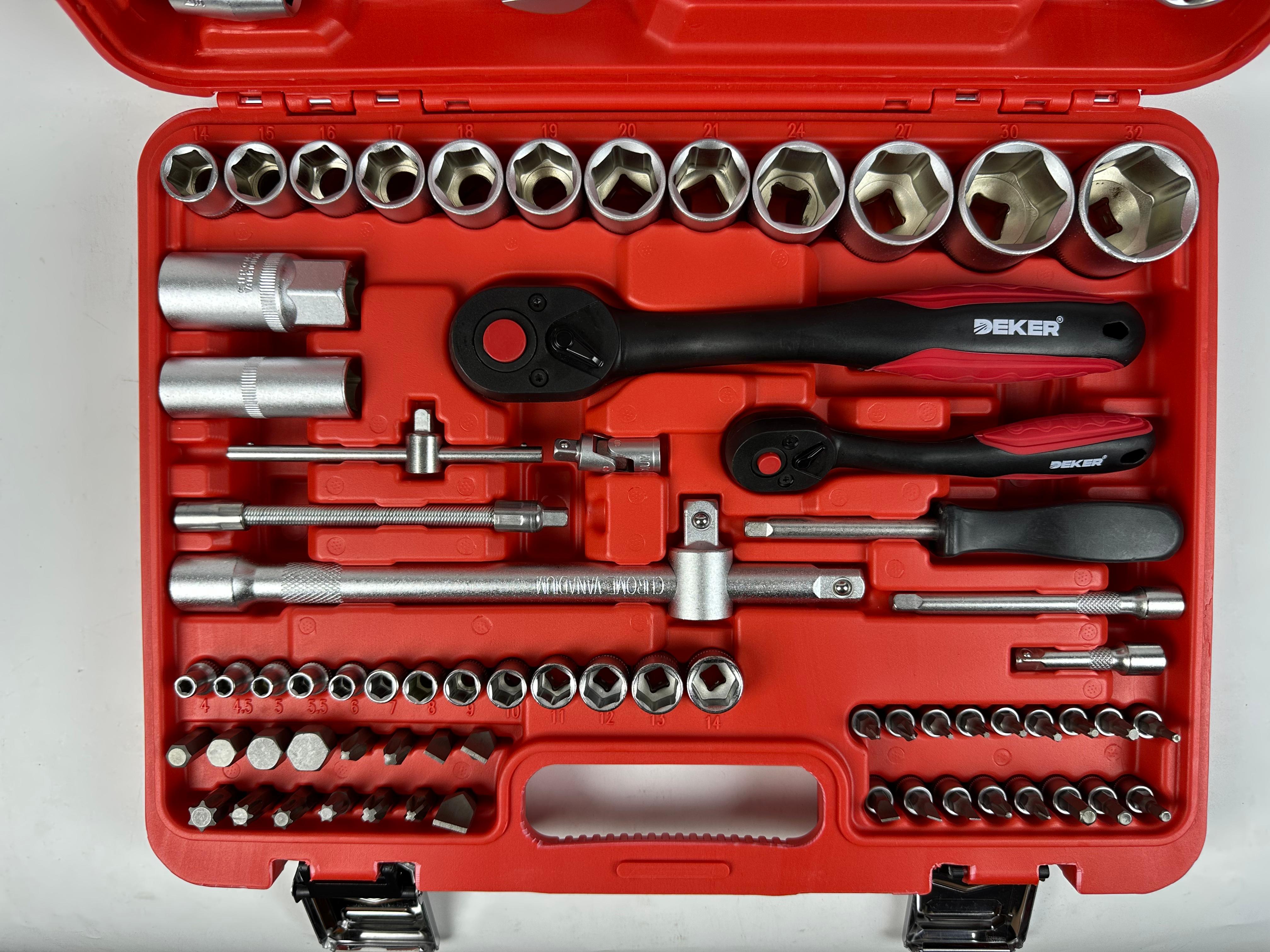 Включает в себя головки 1/4 дюйма и 1/2 дюйма, различные гаечные ключи, отвертки, плоскогубцы и другие необходимые ремонтные инструменты для удовлетворения широкого спектра потребностей в техническом обслуживании.