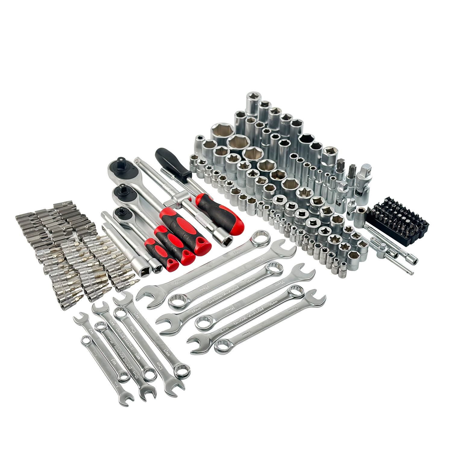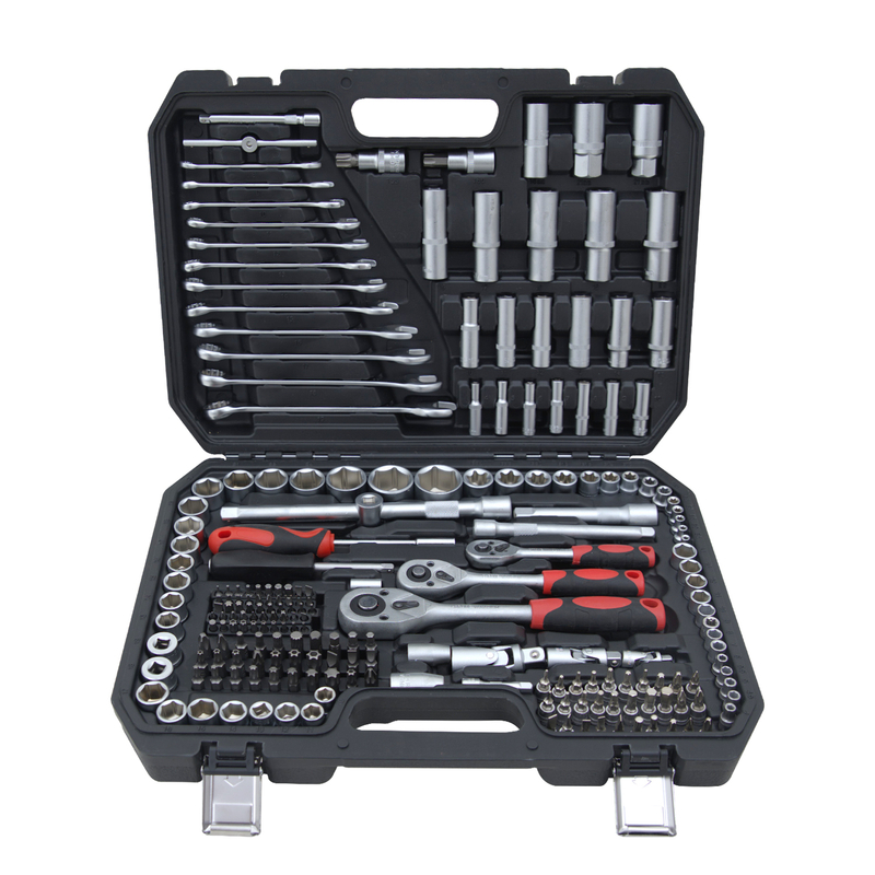 Включает в себя головки 1/4 дюйма и 1/2 дюйма, различные гаечные ключи, отвертки, плоскогубцы и другие необходимые ремонтные инструменты для удовлетворения широкого спектра потребностей в техническом обслуживании.
