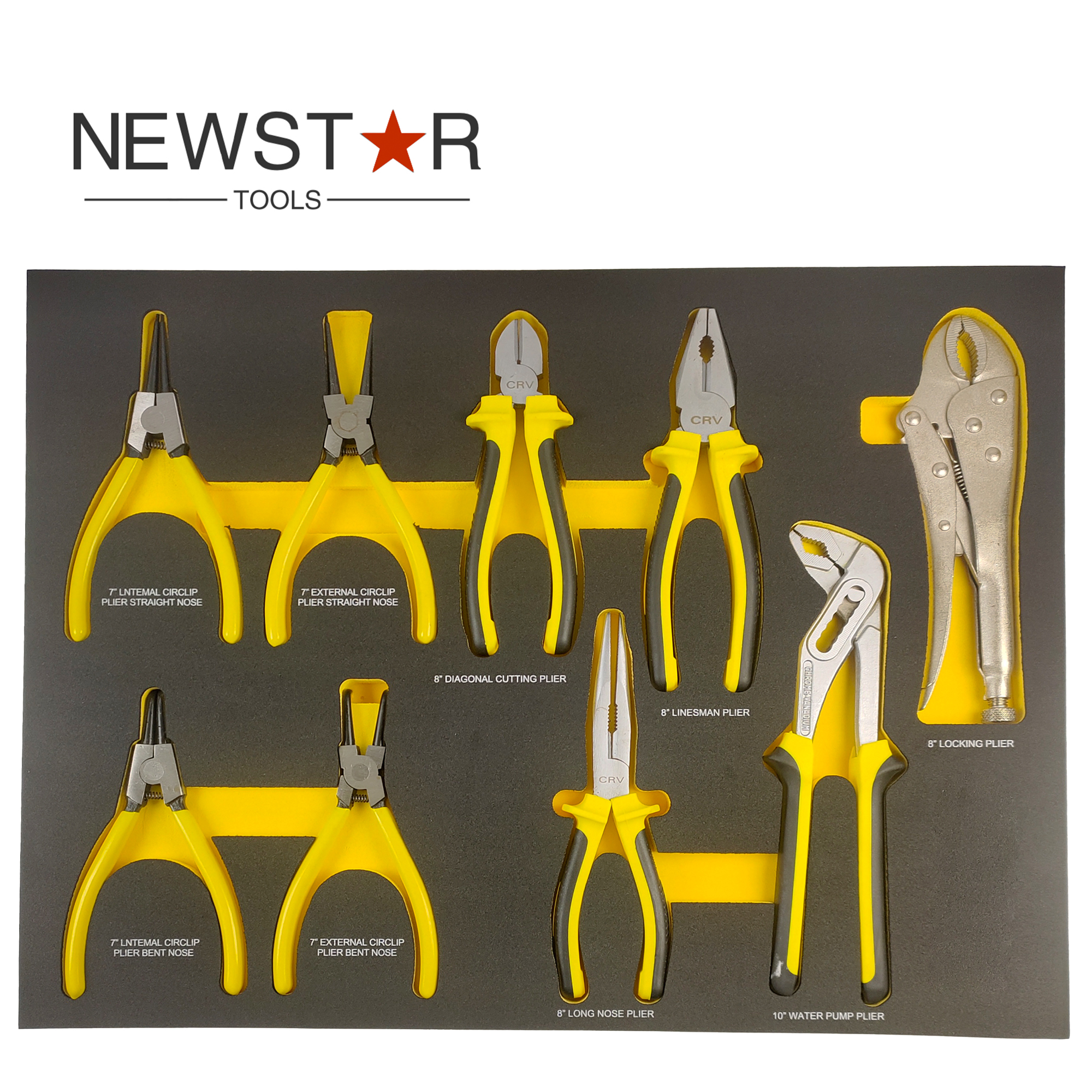 В комплект входят плоскогубцы, молоток, головки, отвертки, шестигранные ключи и плоскогубцы для стопорных колец — эргономичные нескользящие ручки для комфорта и контроля.