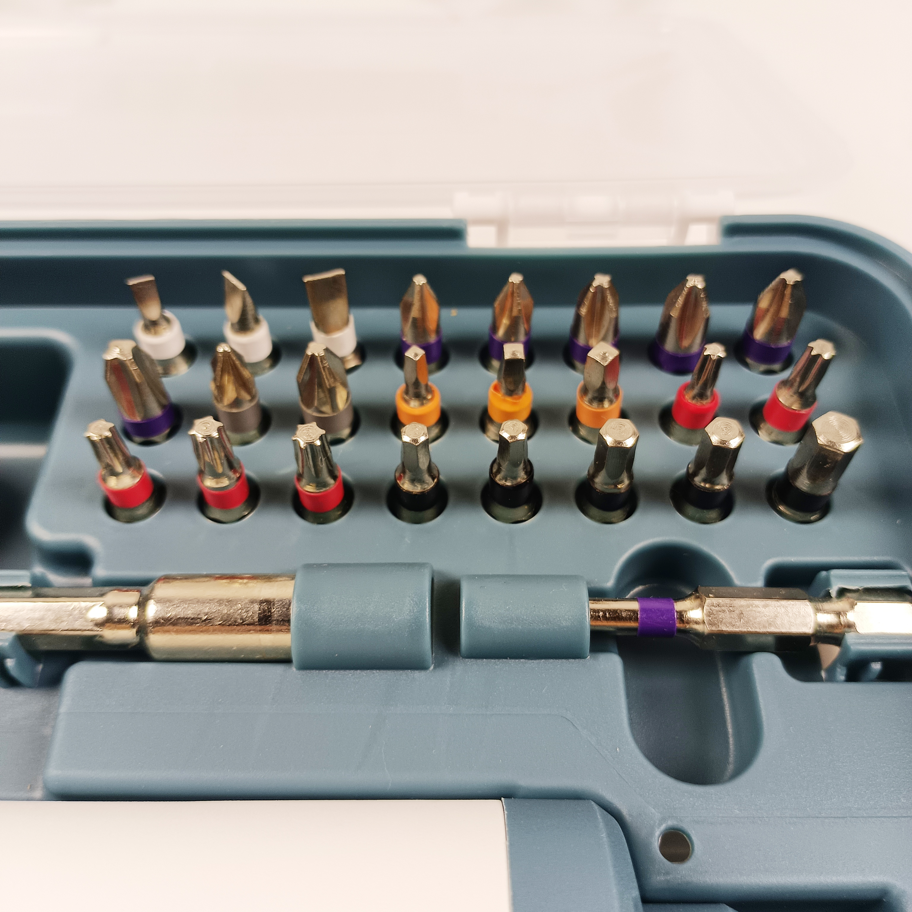 Более 24 бит разных цветов: в том числе Phillips, шлицевые, шестигранные, Torx и другие распространенные типы. Цветные кольца позволяют быстро определить размер.