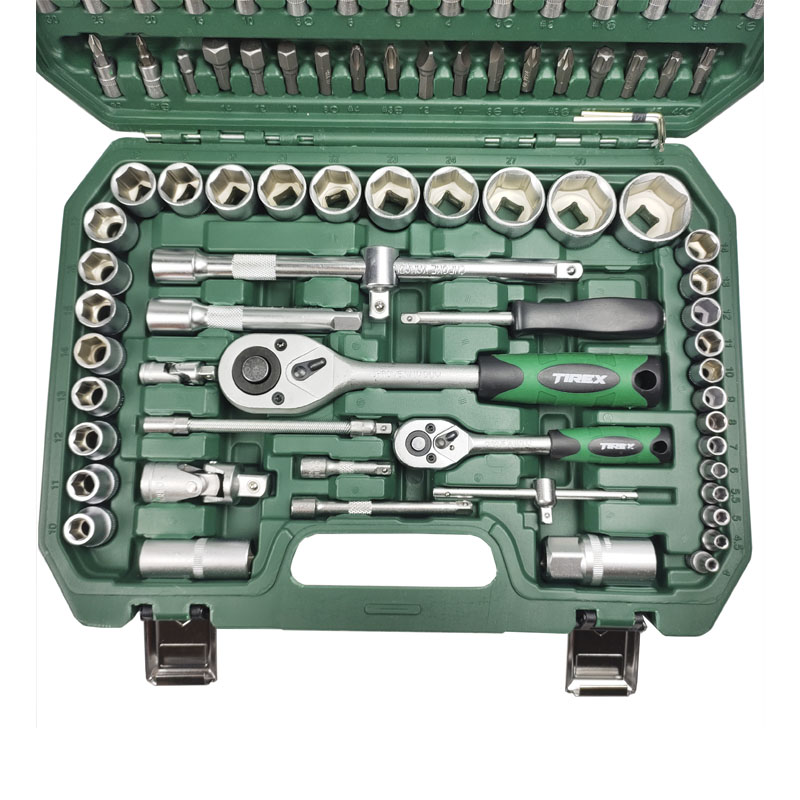 Включает в себя головки 1/4 дюйма и 1/2 дюйма, различные гаечные ключи, отвертки, плоскогубцы и другие необходимые ремонтные инструменты для удовлетворения широкого спектра потребностей в техническом обслуживании.