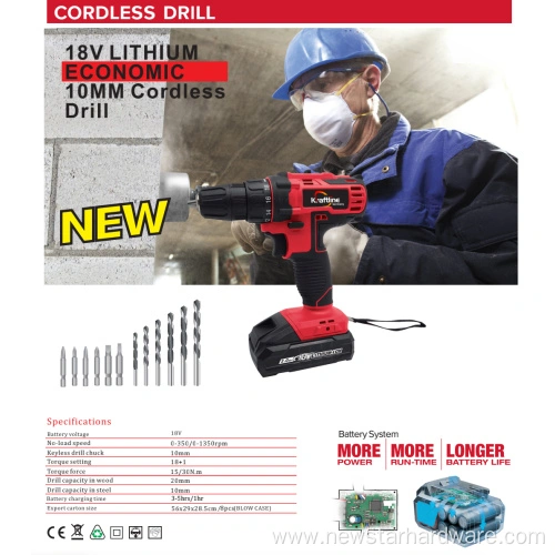 Аккумуляторная дрель: экономичная литиевая дрель 18 В, аккумуляторная дрель 10 мм. Скорость холостого хода 1–350/0–1350 об/мин, Бесключевой сверлильный патрон 10 мм, Настройка крутящего момента 18+1, Крутящий момент 15/30 Н·м, Диаметр сверла по дереву 20 мм, Диаметр сверла по стали 10 мм, Время зарядки аккумулятора 3–5 часов/1 час, Размер экспортной коробки 56x29x28,5 см/8 шт. (ВЫДУВНОЙ КЕЙС)