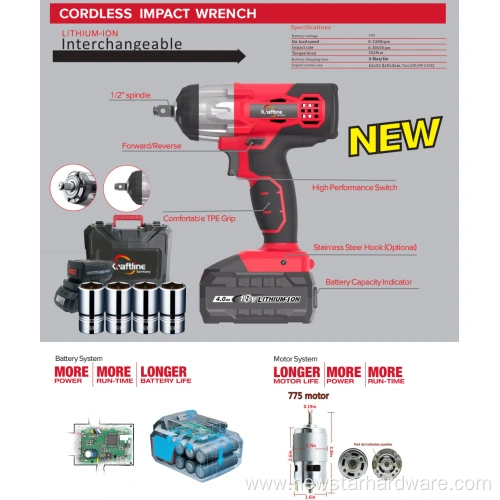 Беспроводной ударный гайковерт: напряжение аккумулятора 18 В, 0–2200 об/мин, скорость холостого хода, 0–3300 ударов в минуту, скорость удара, 280 Нм крутящего момента, 3–5 часов/1 час, время зарядки аккумулятора, 62x32,5x31,5 см. Размер экспортной коробки. Шпиндель 1/2 дюйма, удобная ручка из ТПЭ, высокопроизводительный переключатель, крючок из нержавеющей стали (дополнительно), индикатор емкости аккумулятора.