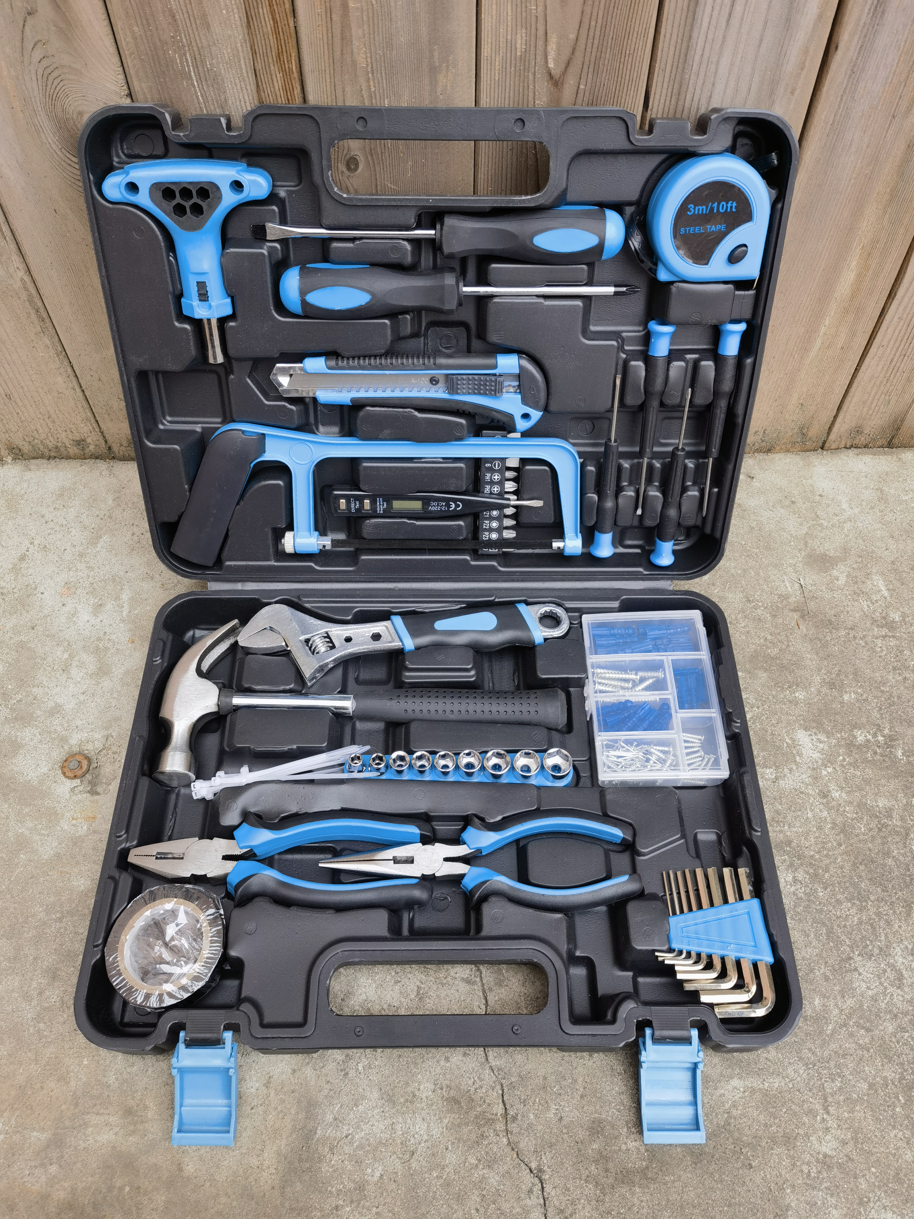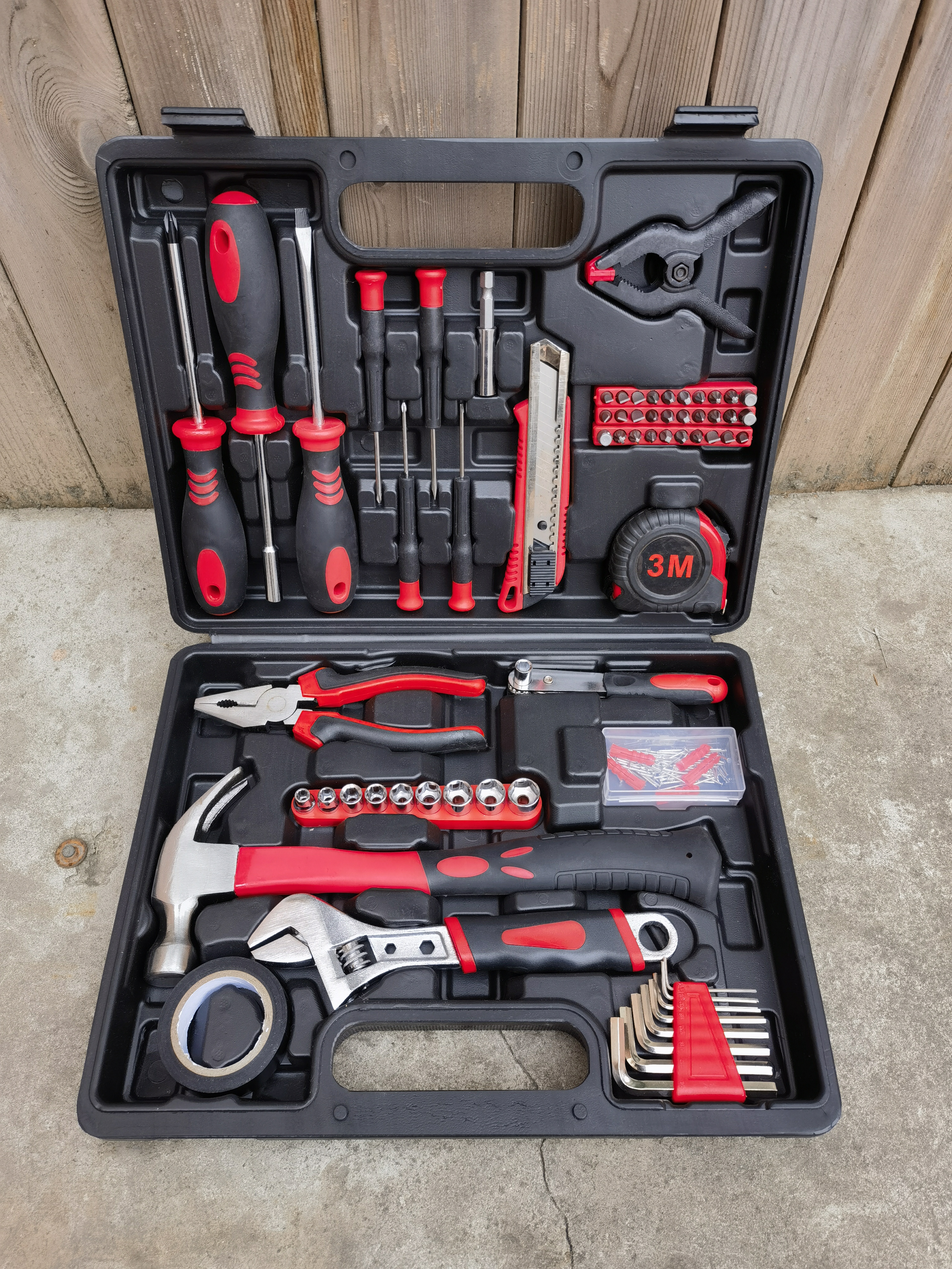 Этот набор инструментов включает в себя различные инструменты, необходимые для ежедневного ремонта, такие как отвертки, молотки, плоскогубцы, пилы, гаечные ключи и т. д., что делает его идеальным выбором для мелкого домашнего ремонта и обслуживания.